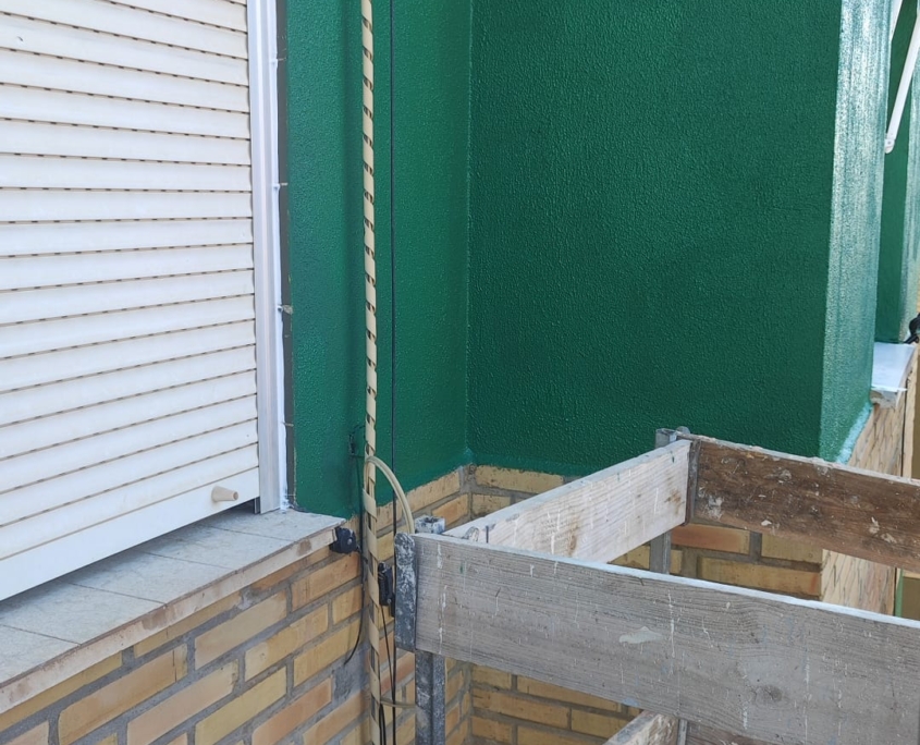 La actuación también contempla la mejora de los balcones, tanto desde el punto de vista funcional como estético. Se están impermeabilizando los suelos para evitar filtraciones y patologías asociadas, al mismo tiempo que se reparan y pintan los techos y los paramentos con acabado enfoscado. Estas intervenciones no solo mejoran la imagen del edificio, sino que incrementan el confort y la seguridad de las viviendas.