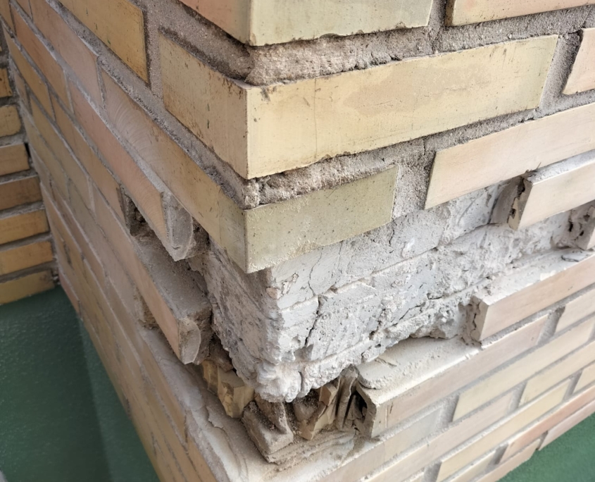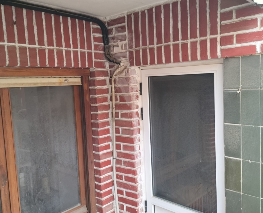 Otro de los focos principales del proyecto es el revestimiento de ladrillo caravista, que presentaba un estado de deterioro considerable. Para su recuperación, se está llevando a cabo un minucioso proceso de reparación y llagueado, devolviendo coherencia y uniformidad al conjunto. Posteriormente, se aplicará un tratamiento hidrófugo que protegerá el ladrillo frente a la humedad sin alterar su aspecto original, alargando así su vida útil y reduciendo futuras necesidades de mantenimiento.
