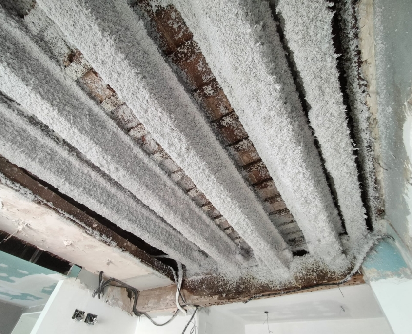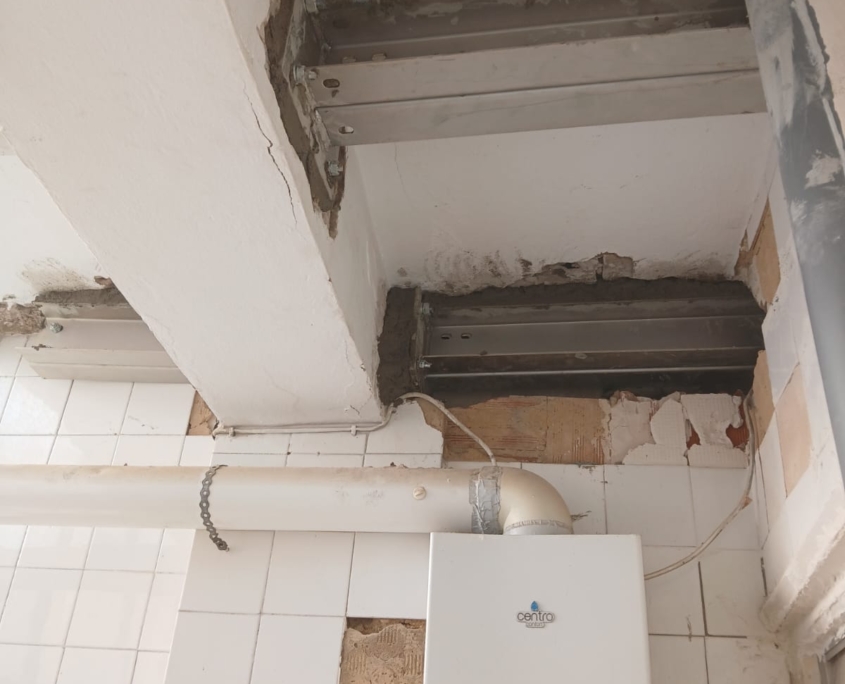 El cemento aluminoso, utilizado en el pasado por sus propiedades de resistencia inicial, puede degradarse con el tiempo, comprometiendo la estructura del edificio. En este caso, tras una revisión técnica y con el objetivo de eliminar cualquier riesgo, se decidió intervenir sobre las viguetas de los forjados, que presentaban signos evidentes de deterioro.