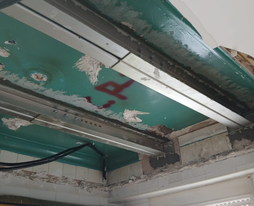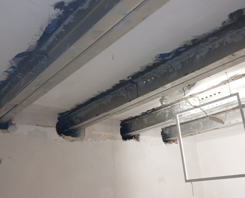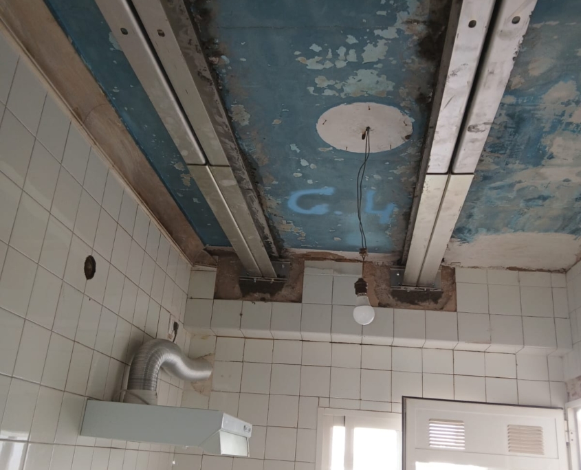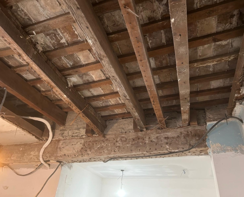 La primera fase del trabajo consistió en la eliminación de los falsos techos, lo que permitió un acceso completo a la estructura original. A partir de ahí, se aplicó una solución eficiente y segura: la instalación del sistema MECANOVIGA, un método de refuerzo estructural que combina perfiles metálicos con una ejecución precisa, ideal para rehabilitar forjados sin necesidad de demoliciones masivas.